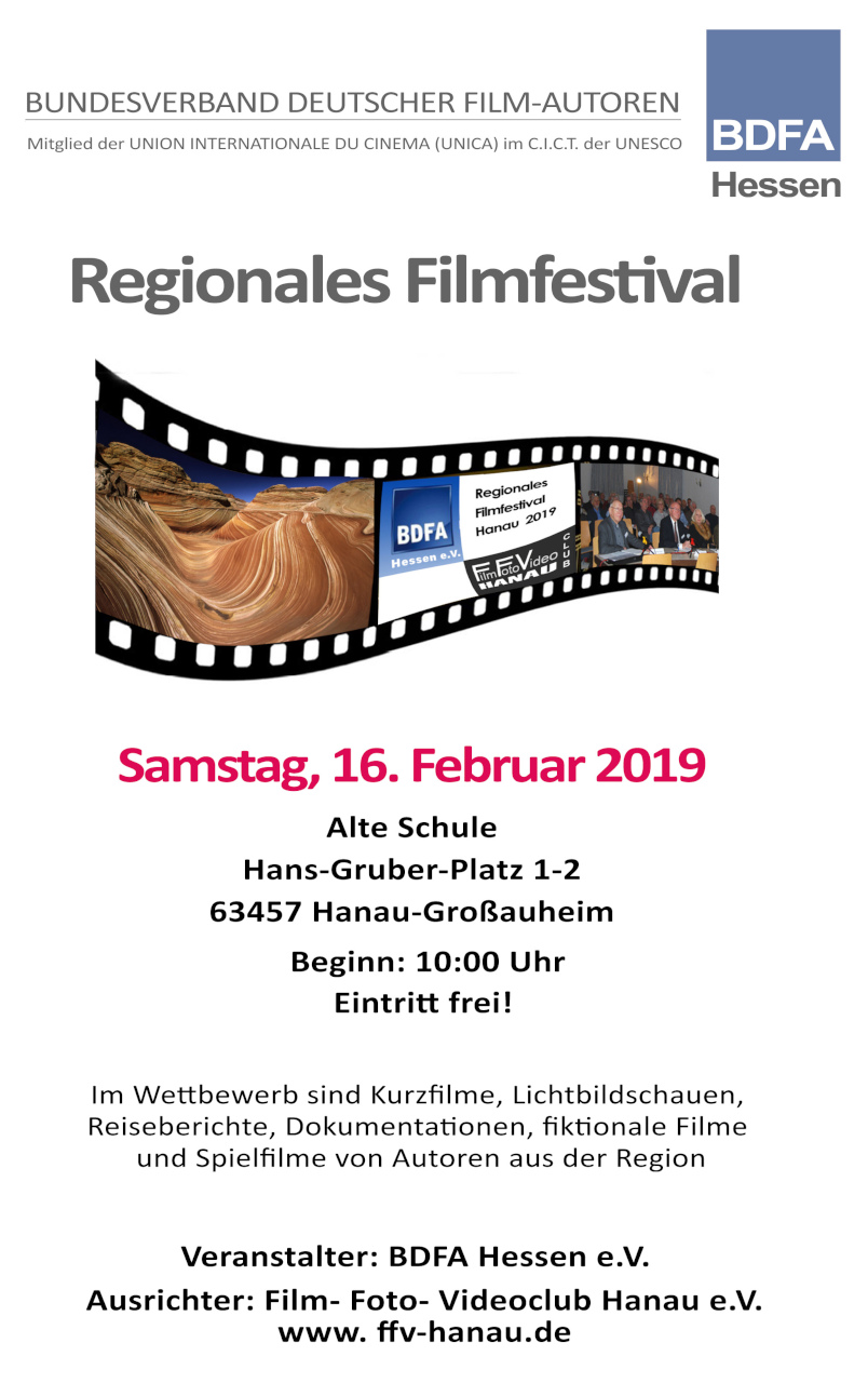 Am Samstag, 16. Februar 2019 findet in der Alten Schule, Hans-Gruber-Platz 1-2, 63457 Hanau-Großauheim, der Regionale Filmwettbewerb des BDFA Hessen (Bundesverband Deutscher Filmautoren, Hessen e.V.) statt. Dazu lädt der Film- Foto- Videoclub Hanau e.V., der die Veranstaltung ausrichtet, die Besucher herzlich ein, einmal vorbei zu schauen.